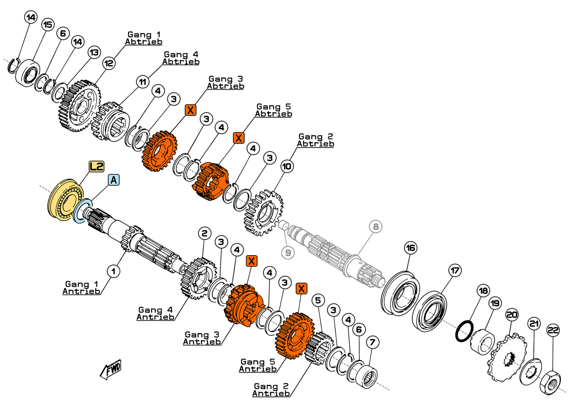 Verbaut sind zwei Getriebewellen: