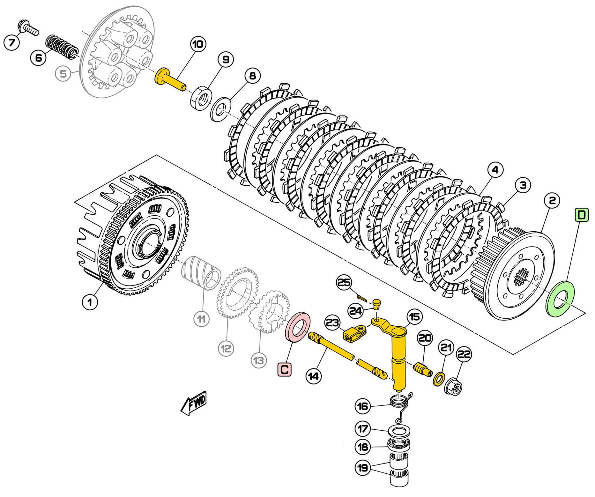 Die gelbe Farbmarkierung zeigt die Teile, die unseres Erachtens dem größten Verschleiß unterliegen.